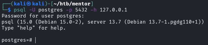./chisel client 10.10.14.13:5555 R:5432:172.22.0.1:5432Afterwards, we can access the database: