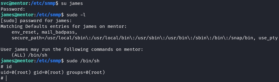 access AllGroup "" any noauth exact AllView none nonWe can then su to james using this and check our sudo privileges, finding that getting a root shell is easy: