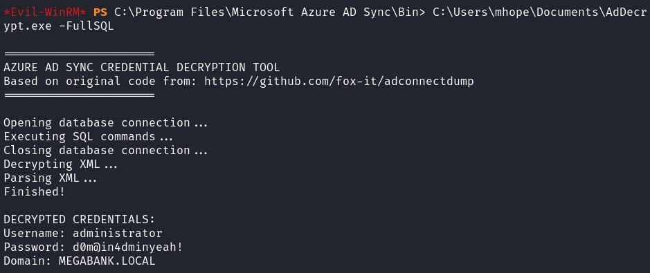 We just need to transfer the AdDecrypt.exe file along with mcrypt.dll to the machine. Then, following the PoC, we need to run this within C:\Program Files\Microsoft Azure AD Sync\Bin.