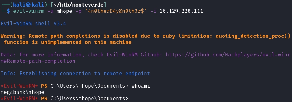 </Objs>I also noticed that this uses Azure to do stuff, so let's keep that in mind for now. Anyways, we can login via evil-winrm with mhope and this password.
