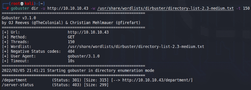 $ gobuster dir -k -u https://10.10.10.43 -w /usr/share/wordlists/dirbuster/directory-list-lowercase-2.3-medium.txt -t 150