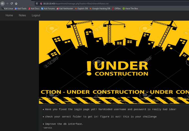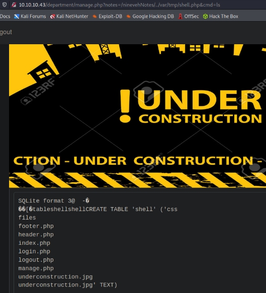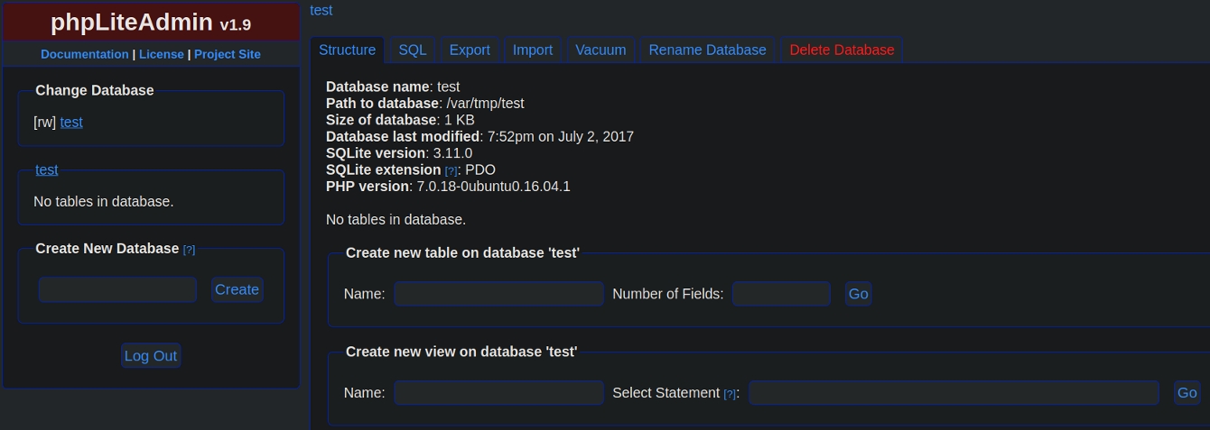We can instantly tell that this is vulnerable to LFI because of the notes parameter in the URL. Next, we can view the phpLiteAdmin admin dashboard: