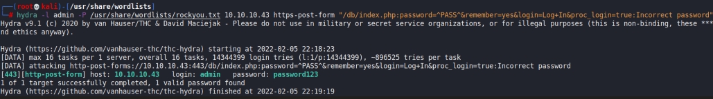 Normally, I don't brute force passwords unless it's my last lead, and at this juncture I had no leads. Brute forcing the logins on both pages were successful with username admin.