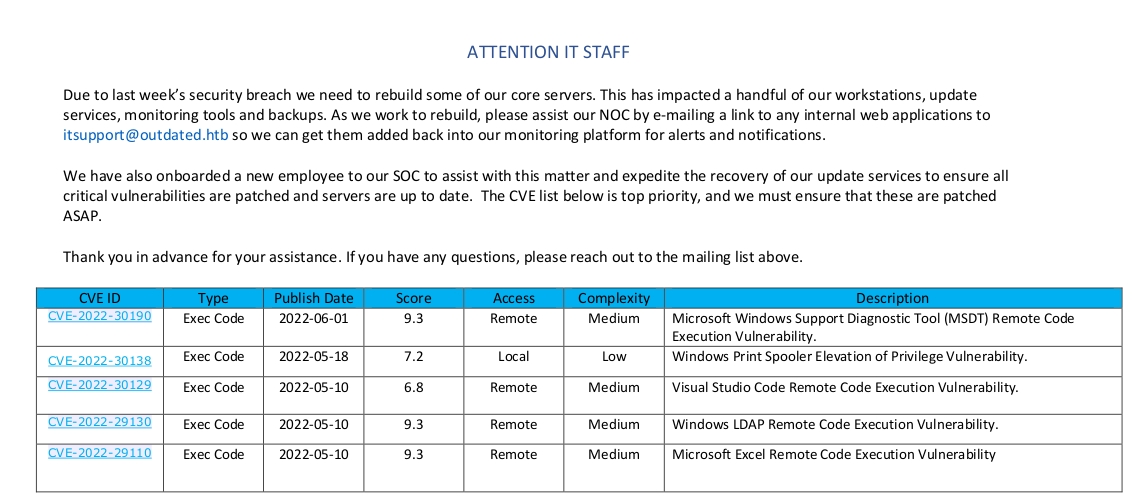 NOC_Reminder.pdf AR 106977 Mon Jun 20 11:00:32 2022When we view the PDF, it talks about how the systems are vulnerable to some CVEs, and that we have to send an email to itsupport@outdated.htb for it.