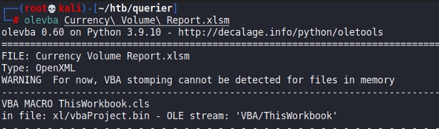 We can see how there are VBA Macros within this file. Again, we can use olevba to extract the code.
