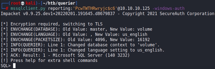 We can then use mssqlclient.py to authenticate as this reporting user for the database that is publicly facing forward.