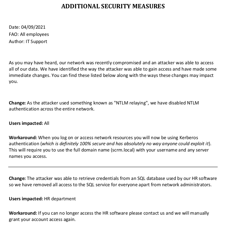 So an attacker was able to retrieve stuff from an SQL database used by HR. Furthermore, the Kerberos authentication bit made me realise that we should be attempting to resolve User SPNs to Kerberoast whatever SQL users there were.