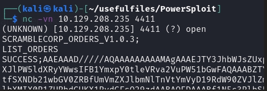 We can send LIST_ORDERS to the port, and it would return some base64 stuff:
