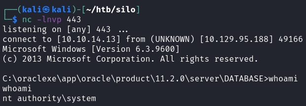 [1] (10.129.95.188:1521): Execute the rev.exe command stored in the \temp pathWe would gain a reverse shell as the administrator.