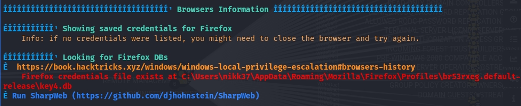 When I ran WinPEAS on this machine, it picked up on a Firefox credential file. We can use firepwd.py to decrypt the passwords.