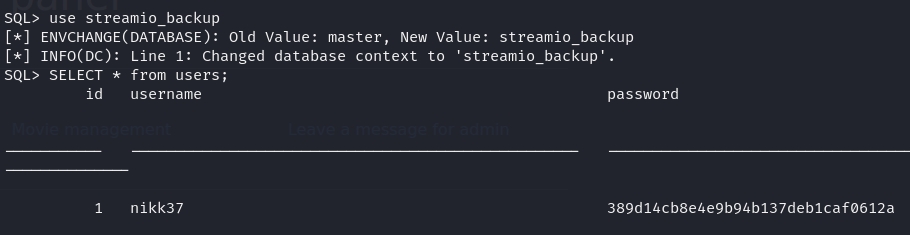 I took a look at the streamio_backup database and found credentials for a nikk37 user.