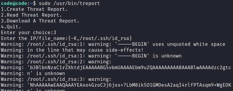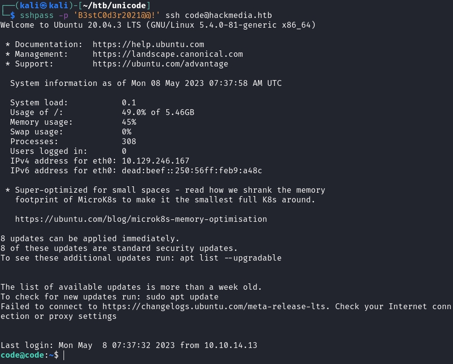 mysql_db: "user"Using this password, we can login as code using ssh.