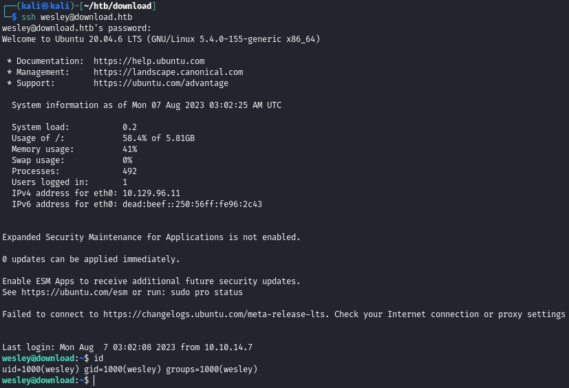 wesley pts/0 10.10.14.7 03:02 0.00s 0.34s 0.01s w