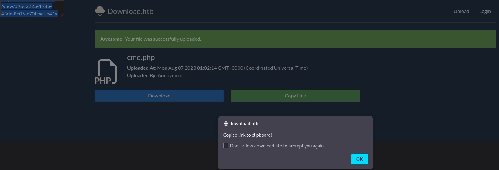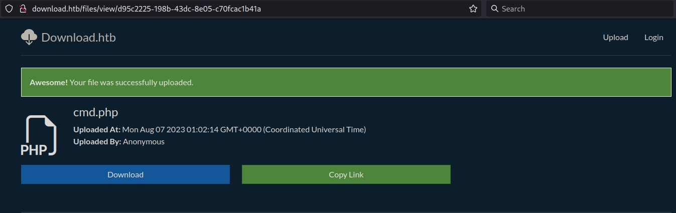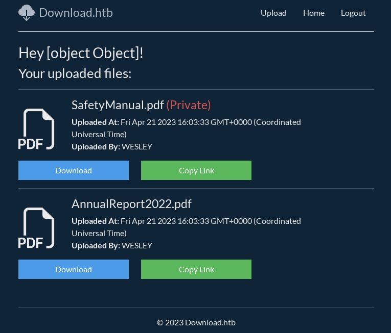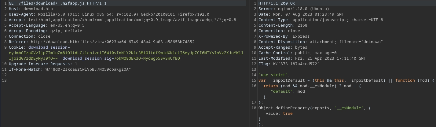 http://download.htb/files/download/0623ba64-6749-48a4-9a08-a58658b74852Perhaps this could be used to download other files and stuff. The uploads to this website are probably being stored within a downloads or uploads folder on the machine, so I attempted some basic LFI with some Express file names, and found that ..%2fapp.js worked: