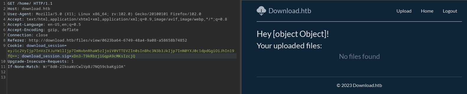 {"flashes":{"info":[],"error":[],"success":[]},"user":{"id":16,"username":"test123"}}The .sig cookie is different too, and based on the extension of it I think it is the signature of the cookie or something. Since this was running Express, I googled for cookie related exploits pertaining to that, and found this repository: