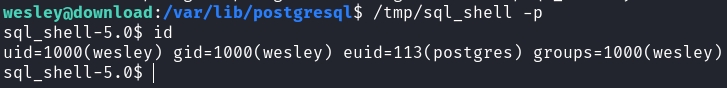 However, we are still technically wesleyinstead of postgres even if the EUID changes. We can replace the command executed with a reverse shell instead: