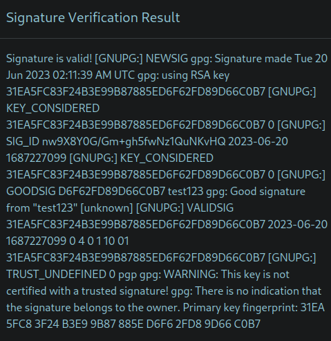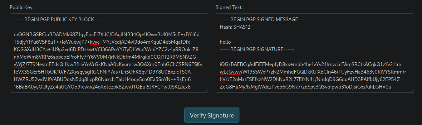 Afterwards, we can input some encrypted message to verify that it has been signed properly.