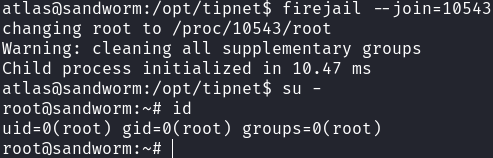 You can now run 'firejail --join=10543' in another terminal to obtain a shell where 'sudo su -' should grant you a root shell.
