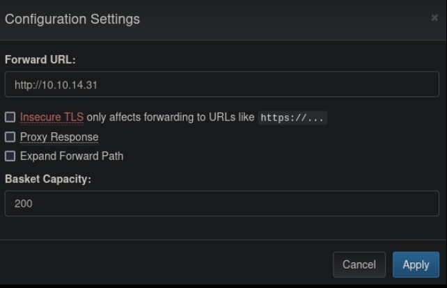 We are able to set the Responses from the website. as well as where the traffic is being forwarded to, just like we can with Webhooks. Setting the Forward URL to our own HTTP server results in requests being sent there from the machine.