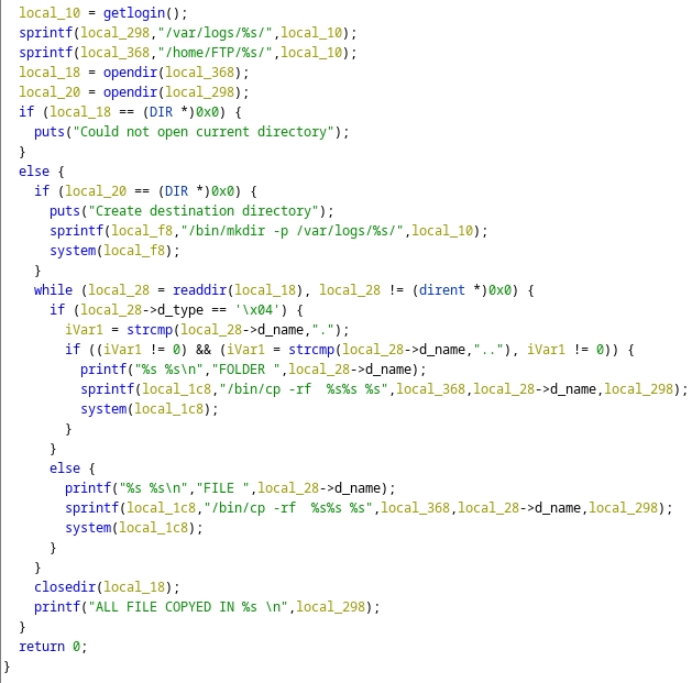 All the binaries use their full path values, so no path hijacks here. However, this seems to use directories within /var/logs and /home/FTP. I was already thinking of command injection using subshells, and it seems that this is the exploit needed.