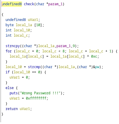 +++ exited (status 0) +++The bad characters don't include '$' and '()', opening up the possibility of command injection. Moving to ghidra, this binary prompts for a password before running the check() function to see if the password is correct, and then copy() if it is right: