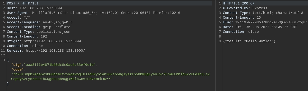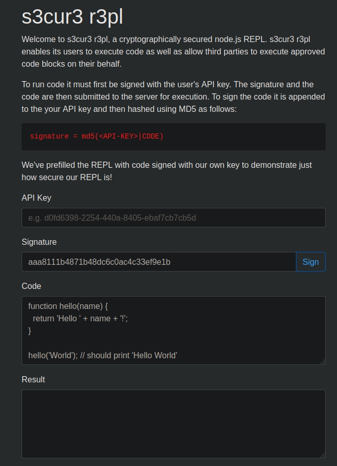 This seems to be a 'secure' way to run NodeJS code within the browser. This program checks for whether the signature (which is the MD5 Hash of API-KEY | CODE. We don't know the API key, and we only know the code to be run.