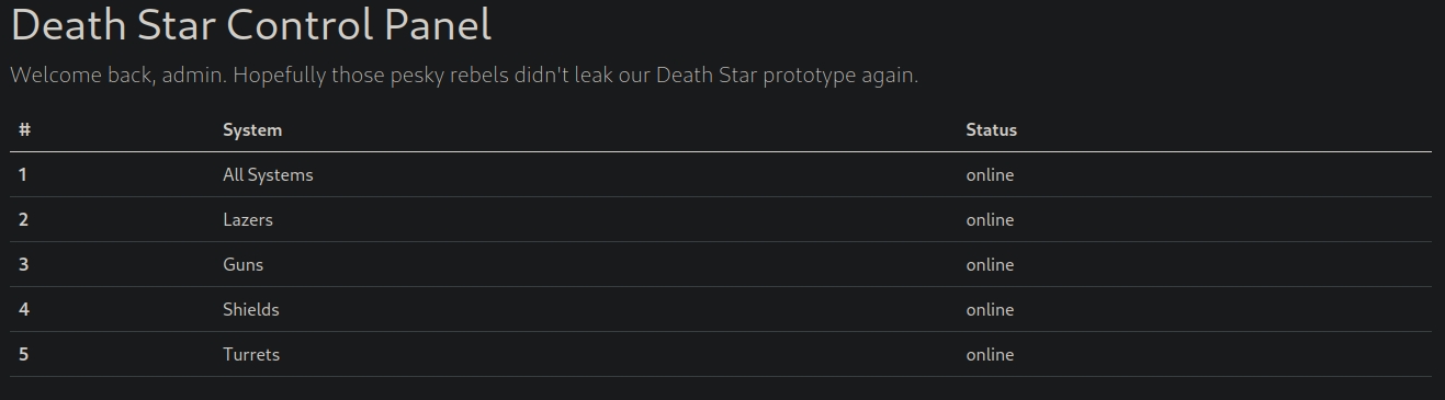 const pass = process.env.DEATH_STAR_PASSWORDWeb Enumeration -> Admin Creds