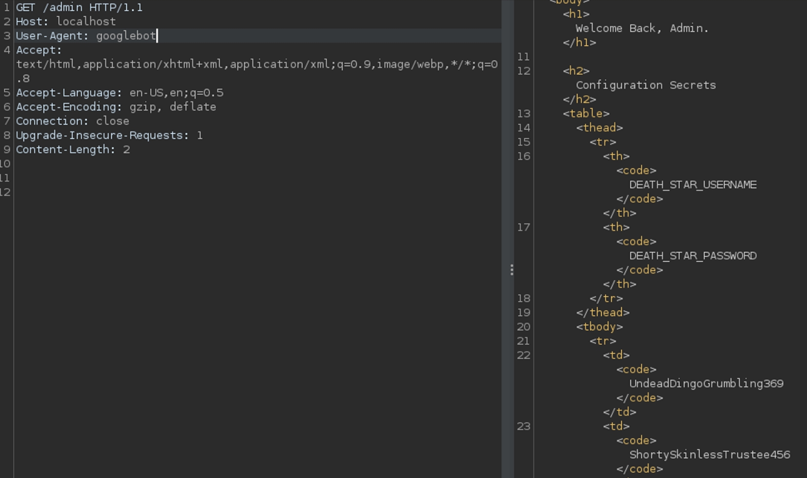It's from the official guide, so I can't see this leading to any vulnerabilities? Fingers crossed? I'm not really familiar with Nginx configuration files so I'm not sure.Basically, we are given the nginx configuration files and can see that there are checks on the User-Agent. We can change this to googlebot, and another directory scan finds other directories: