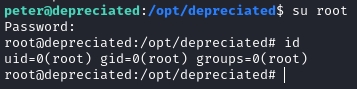 peter@depreciated:/opt/depreciated$ cat code.txt