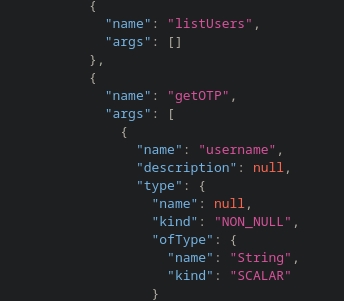 {__schema{types{name,fields{name,args{name,description,type{name,kind,ofType{name, kind}}}}}}}Using this, we can find two interesting functions: