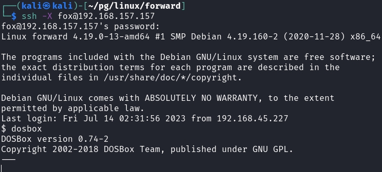 /usr/bin/dosboxTo exploit this, we need some form of GUI but RDP and VNC are both not available on this machine. Googling for 'SSH Dosbox Forwarding' brought up this Reddit post referring to x11: