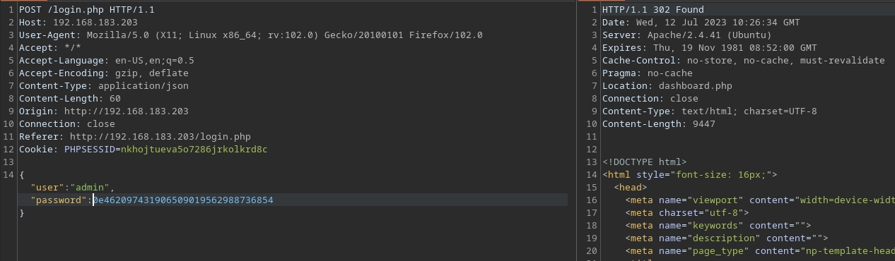 Default credentials don't work here. Brute forcing also doesn't work. Since this runs on PHP, we can try some Magic Hashes by submitting this request: