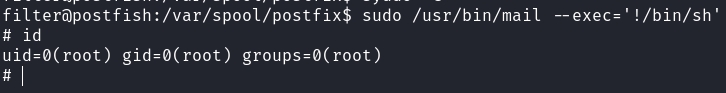 (ALL) NOPASSWD: /usr/bin/mail *We can get a root shell using the commands from GTFOBins: