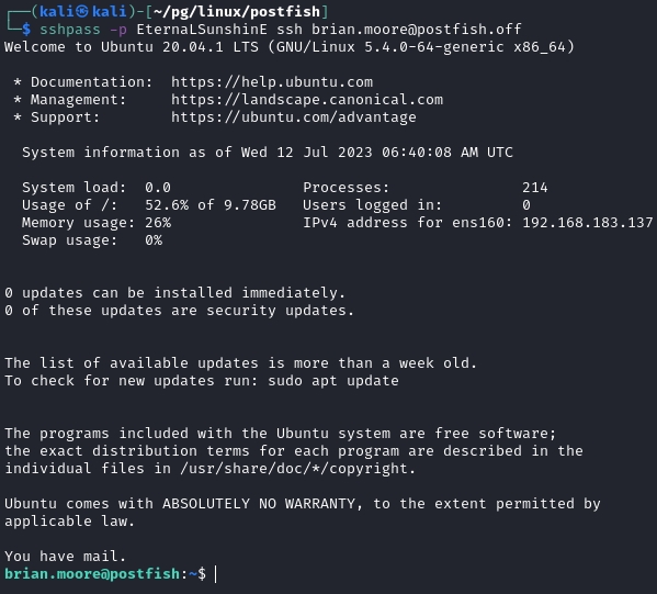$ sed -i s/$/@postfish.off/ usernamesAfterwards, we can test which user is present on the server: