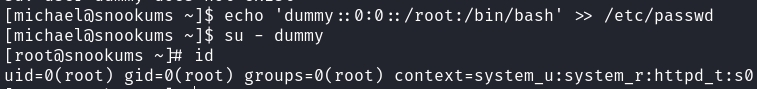 -rw-r--r--. 1 michael root 1162 Jun 22 2021 /etc/passwdUsing this, we can easily create a new root user.